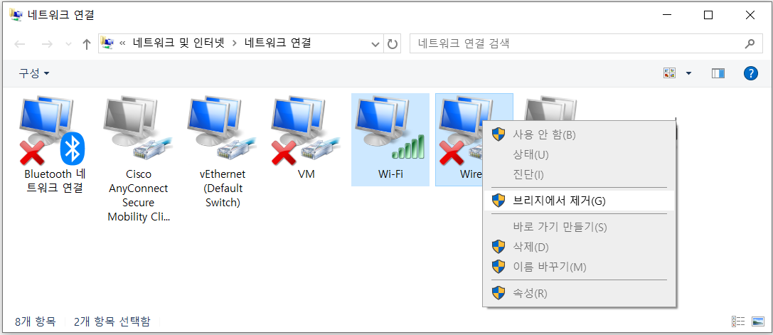 삭제 방법 또한 아주 간단합니다. 브리지로 설정된 2개의 어댑터를 선택 후 "마우스 오른쪽" 클릭하시고, "브리지에서 제거"를 클릭하시면 됩니다.