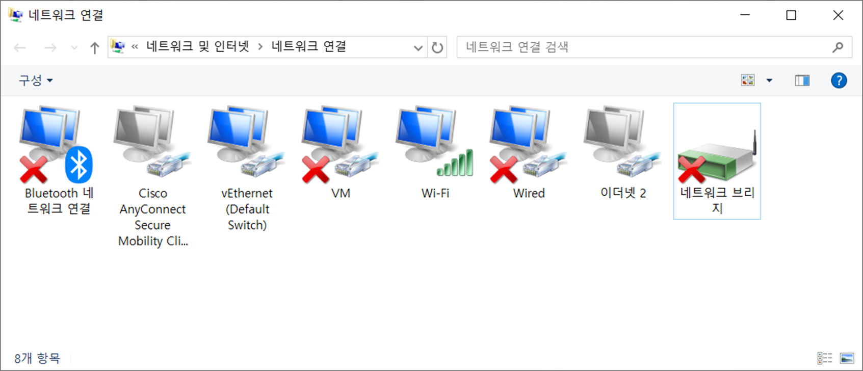위 그림처럼 "네트워크 브리지"와 브리지로 설정된 모든 어댑터가 정상적으로 연결된 것을 확인하실 수 있습니다.