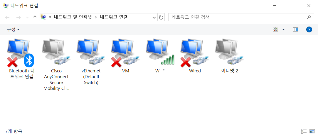 와이파이로 공유기에 연결은 하였지만, PC에 유선으로 다른 PC를 연결하지 않았기에 "X"가 표시되어 있어요.