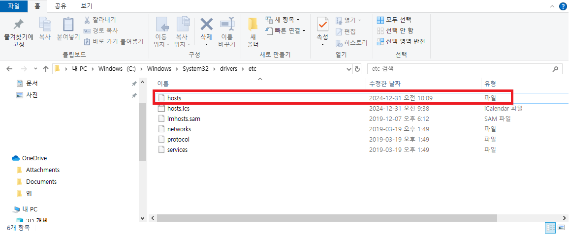 이 "Hosts 파일"은 C:\Windows\System32\drivers\etc\ 폴더 안에 있습니다.