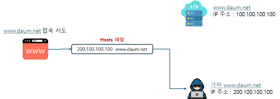 이 파일을 "변조"한다면 내가 원하는 사이트가 아닌 해커가 만들어놓은 사이트로 연결이 되도록 할 수 있습니다.