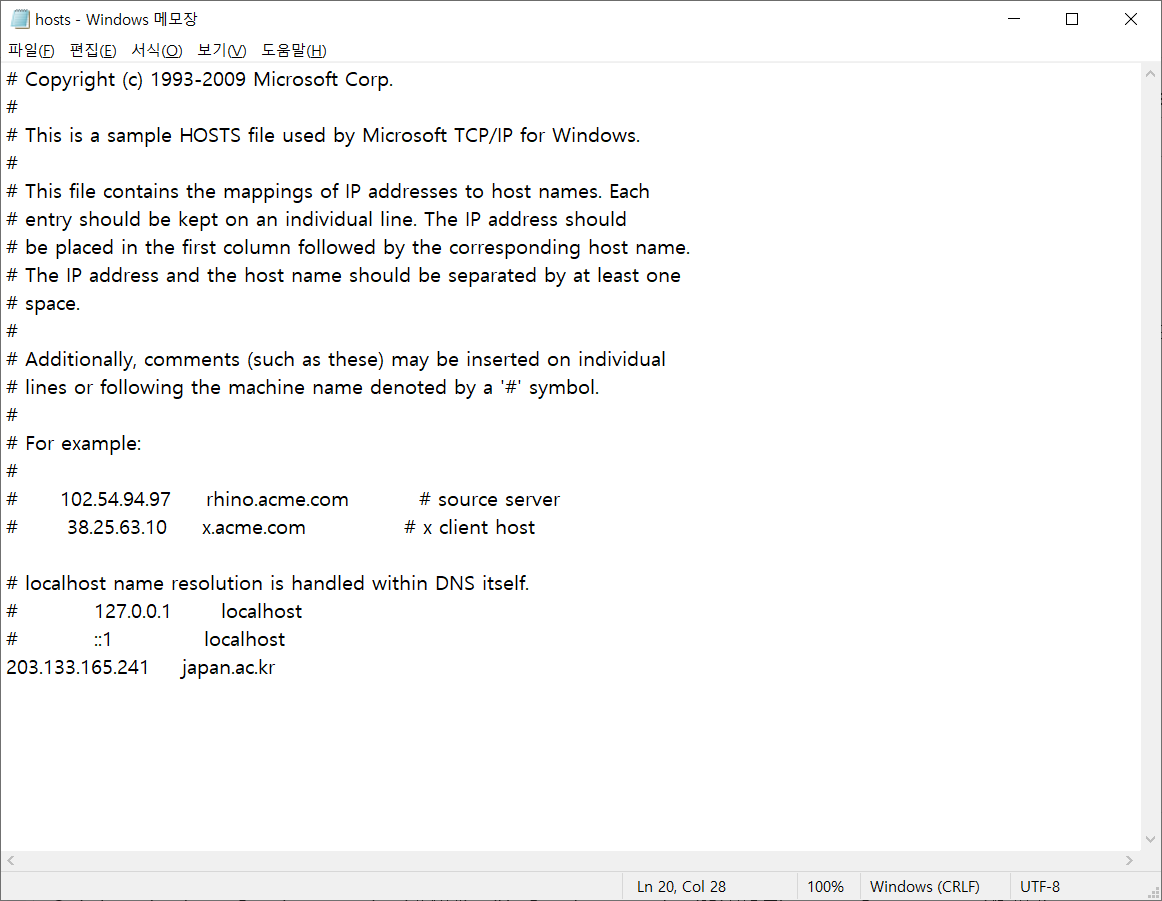 hosts 파일을 메모장으로 열어서 japan.ac.kr이 203.133.165.241 이라고 한 줄 추가하였습니다.