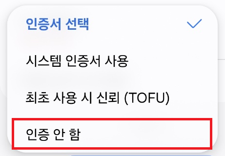 한가지 더 해주셔야 하는데요. "CA 인증서"를 "인증 안 함"을 선택해주시면 됩니다.