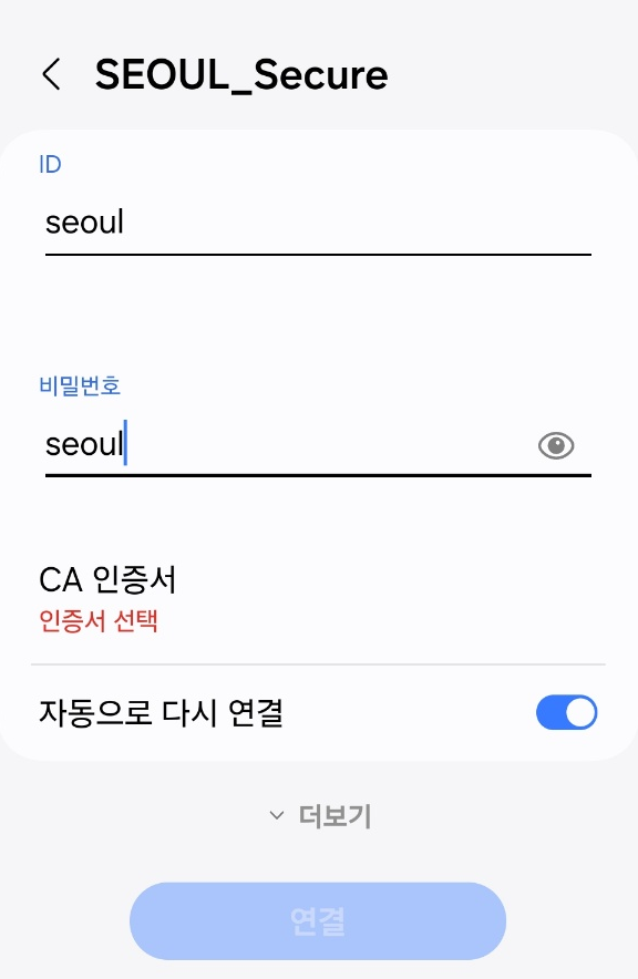 SSID는 "SEOUL_Secure"로 연결해주시면 되는데요.