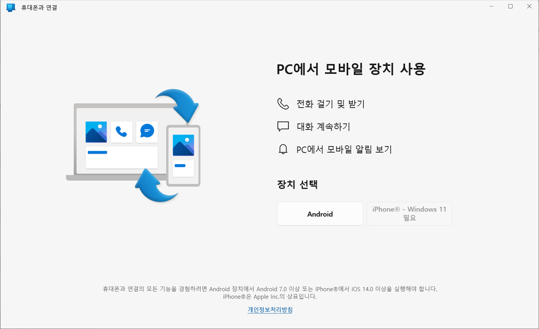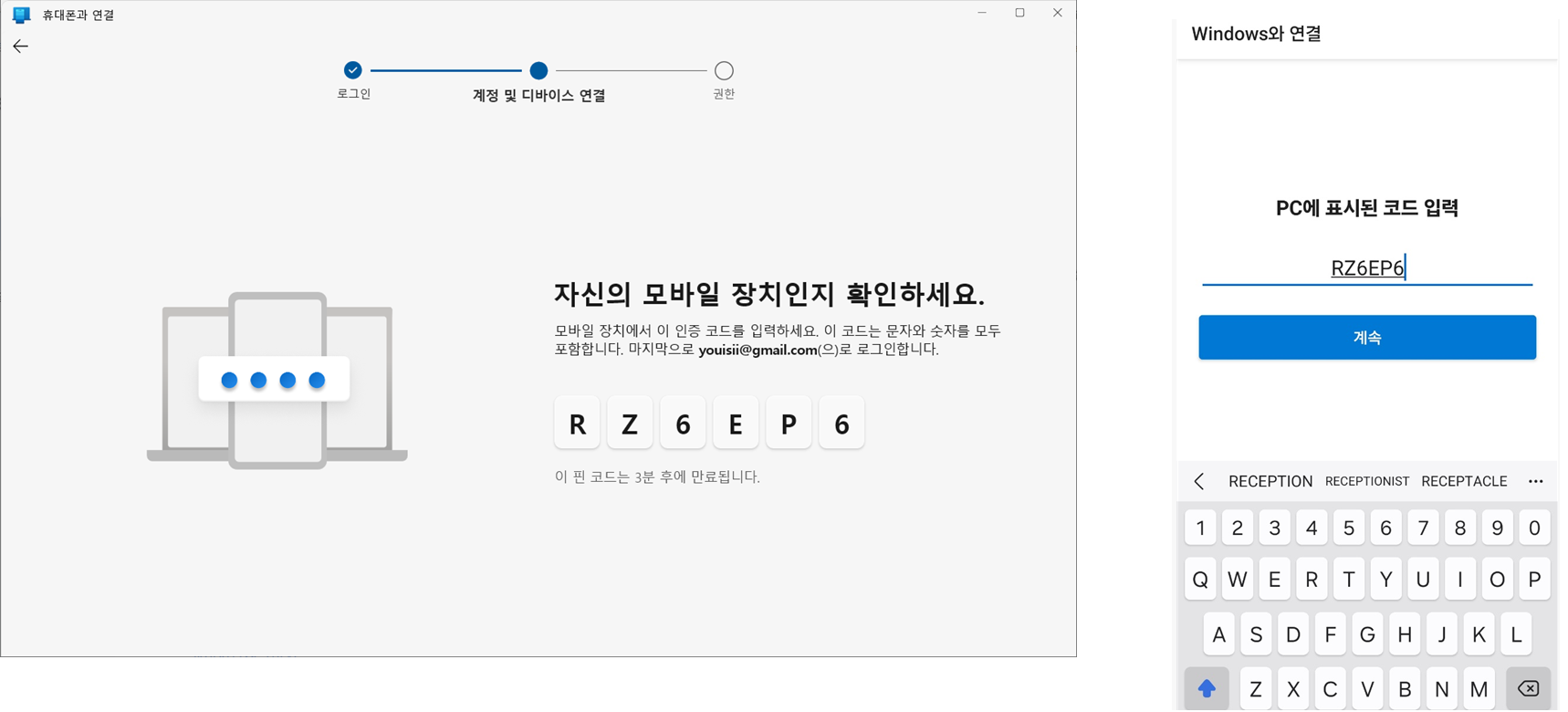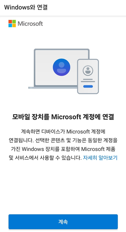 6. 휴대폰에서 QR 코드를 로딩하시면, 아래와 같이 Window와 연결 창이 나타납니다. 계속 진행해주세요.