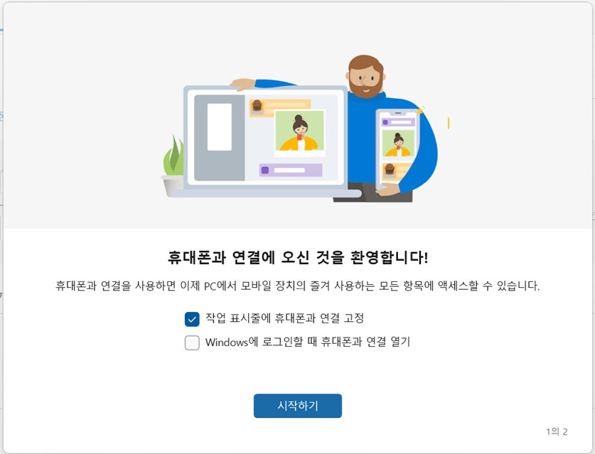 1. 윈도우 버튼을 누르시고, "휴대폰과 연결"을 누르세요.