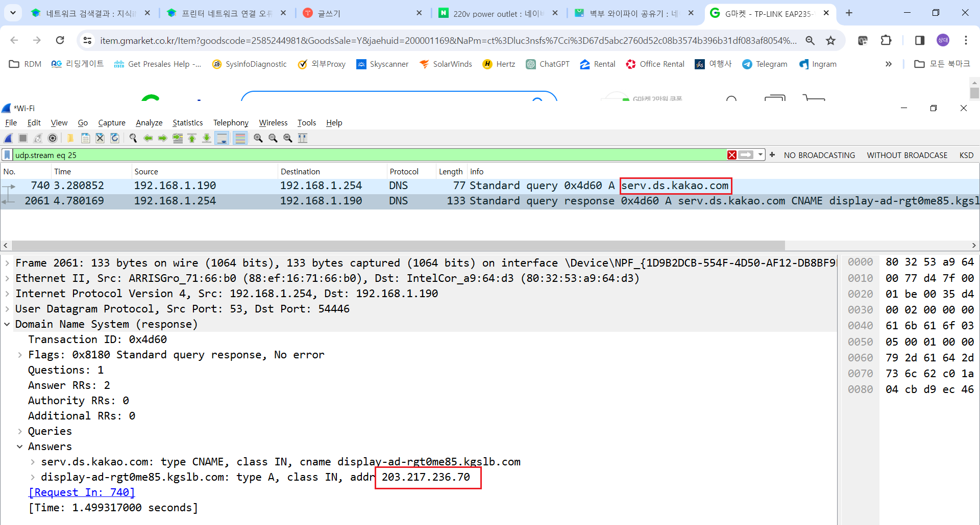 아래 그림을 보시면 내가 요청한 URL 주소에 대한 IP 주소를 응답받는 것을 확인하실 수 있습니다.