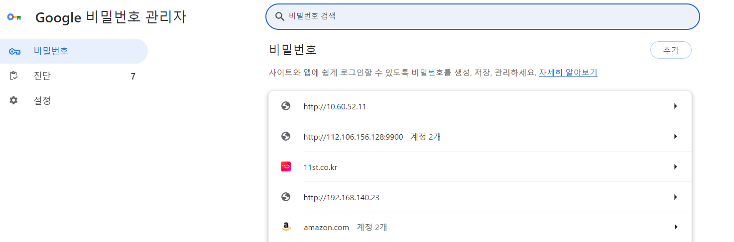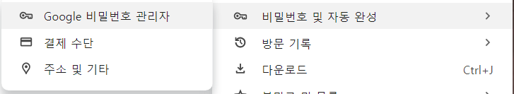 브라우저 매뉴의 "비밀번호 및 자동 완성" -> "Google 비밀번호 관리자"에 들어가시면 저장되어 있는 모든 사이트의 ID, 비밀번호 정보를 확인하실 수 있습니다.