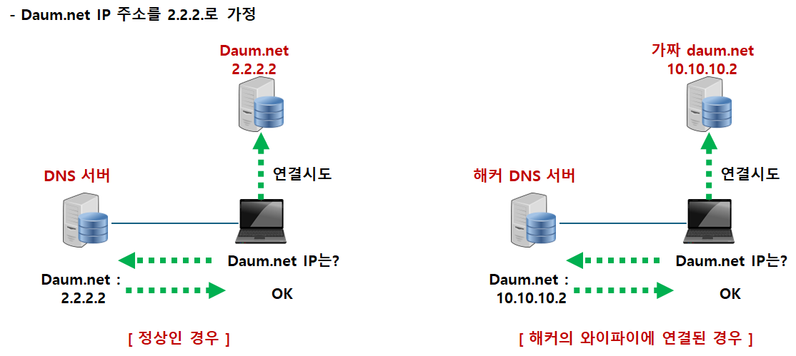 이 외에도 사용자의 웹 접속요청을 Redirection 시키거나, 해커가 만든 "DNS 서버"의 주소를 할당하여 사해커가 만들어놓은 가짜 사이트로 연결을 유도할 수도 있습니다.