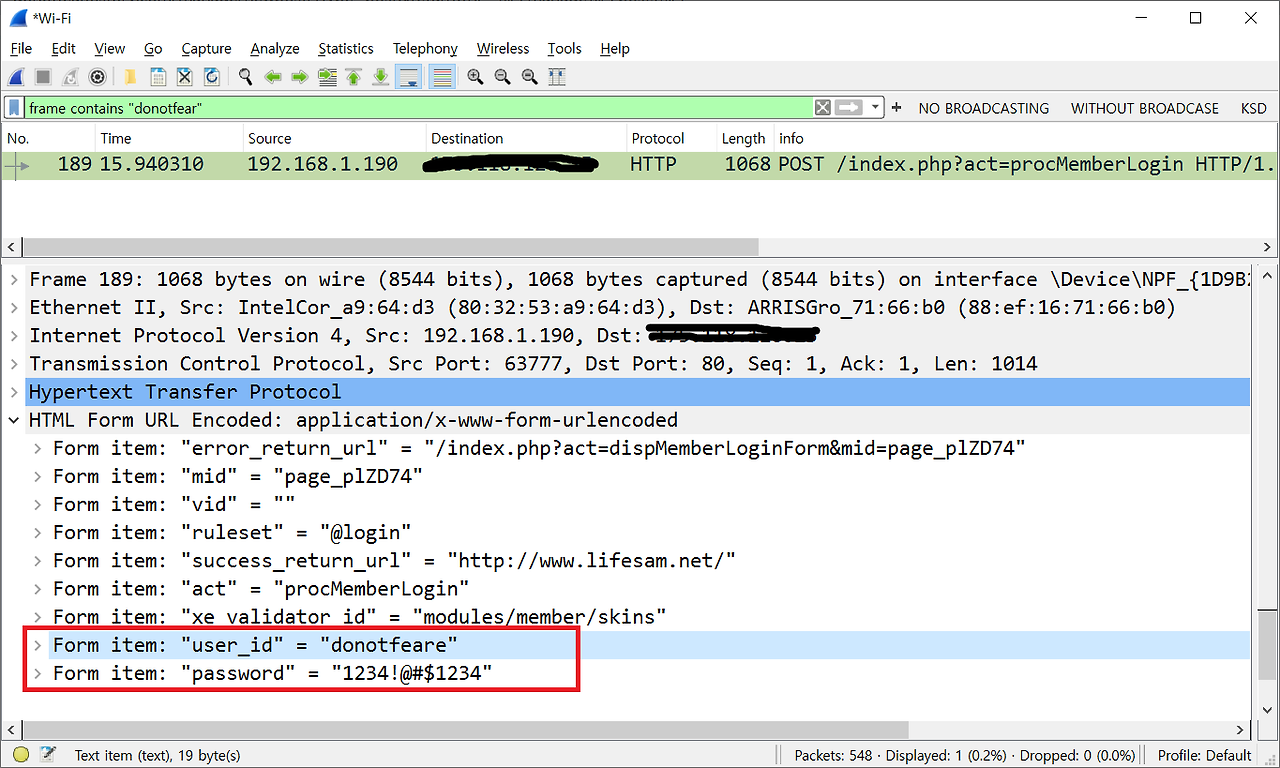 이처럼 해커가 준비한 와이파이에 연결된 후 인터넷을 사용할 경우, HTTPS 사이트는 암호화 되어 있기에 복호화 하기가 어렵지만, HTTP 사이트는 너무나 쉽게 입력한 정보들을 탈취할 수 있게 됩니다.
