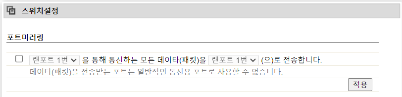 아래와 같이 "포트미러링"이라는 기능이 있는데, 이 기능은 모든 데이터를 다른 포트로 복사하여 전송하는 기능입니다.