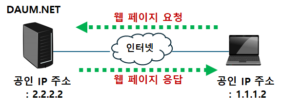 이와 같이 내 컴퓨터도 DAUM.NET을 찾아가려면 DAUM.NET의 IP 주소를 알아야 하고, DAUM.NET 서버가 내가 요청한 페이지를 보내주려면 나의 IP 주소를 알아야 합니다.
