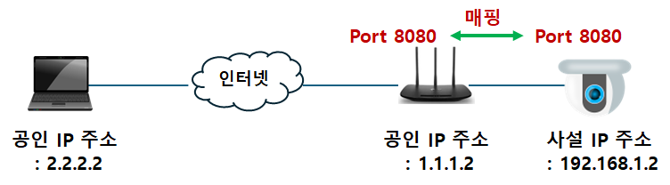 이 경우, 사설 IP 주소를 가지고 있는 CCTV를 외부에서 연결할 수가 없겠죠? 이따 필요한 것이 바로 "포트포워딩" 입니다.