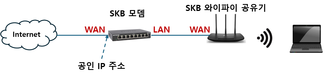 SKB 모뎀의 WAN 포트는 외부에서 공인 IP 주소를 받아오고, LAN 포트의 DHCP 서버 기능으로 SKB 와이파이 공유기의 WAN 포트에 사실 IP 주소를 할당해주게 됩니다.
