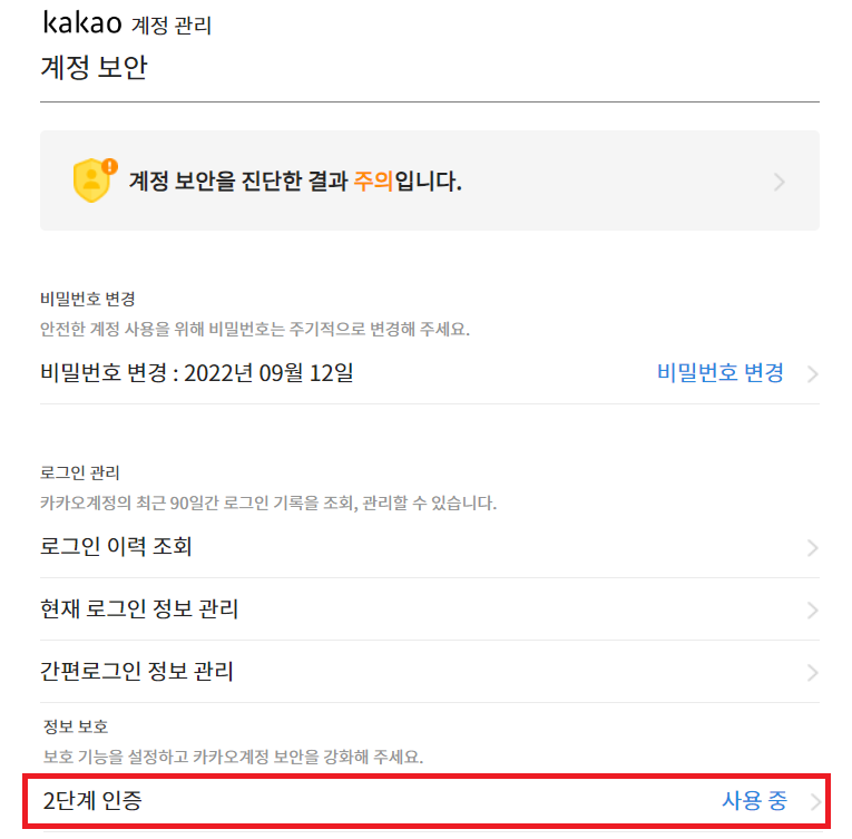 카카오의 2단계 인증 화면입니다.