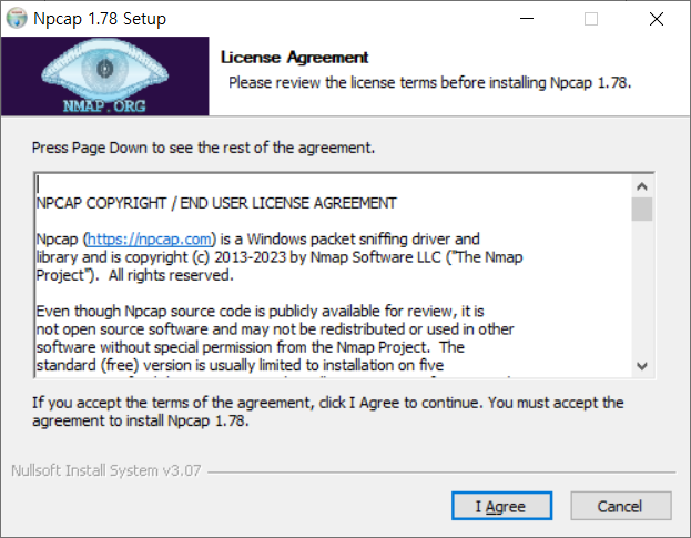 중간에 NPCAP 설치를 위한 "License Agreement" 창이 나타날텐데요. "I Agree"를 클릭해주세요.