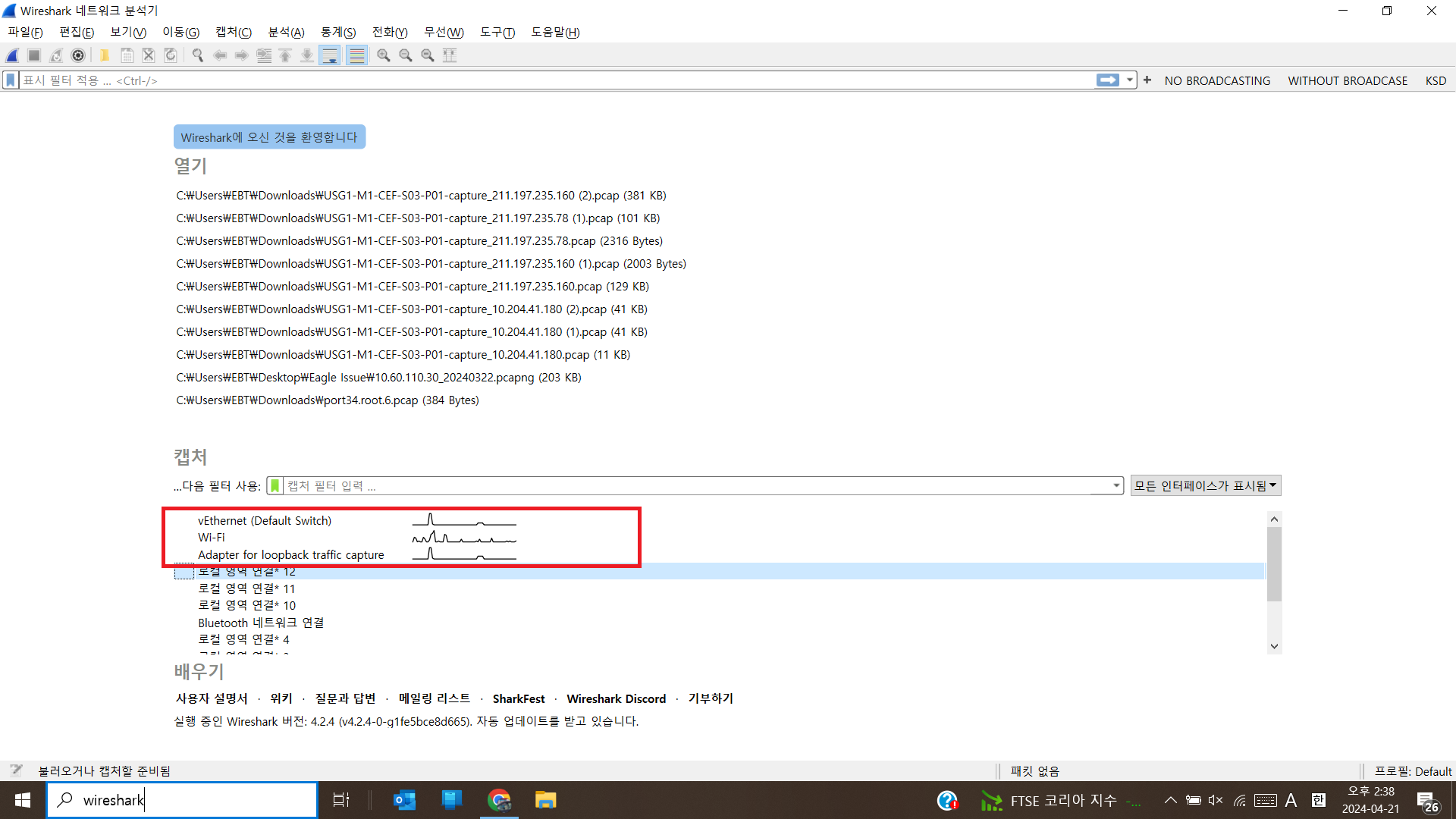 자, 그럼 윈도우를 누르시고, "Wireshark"를 한번 실행해봐요