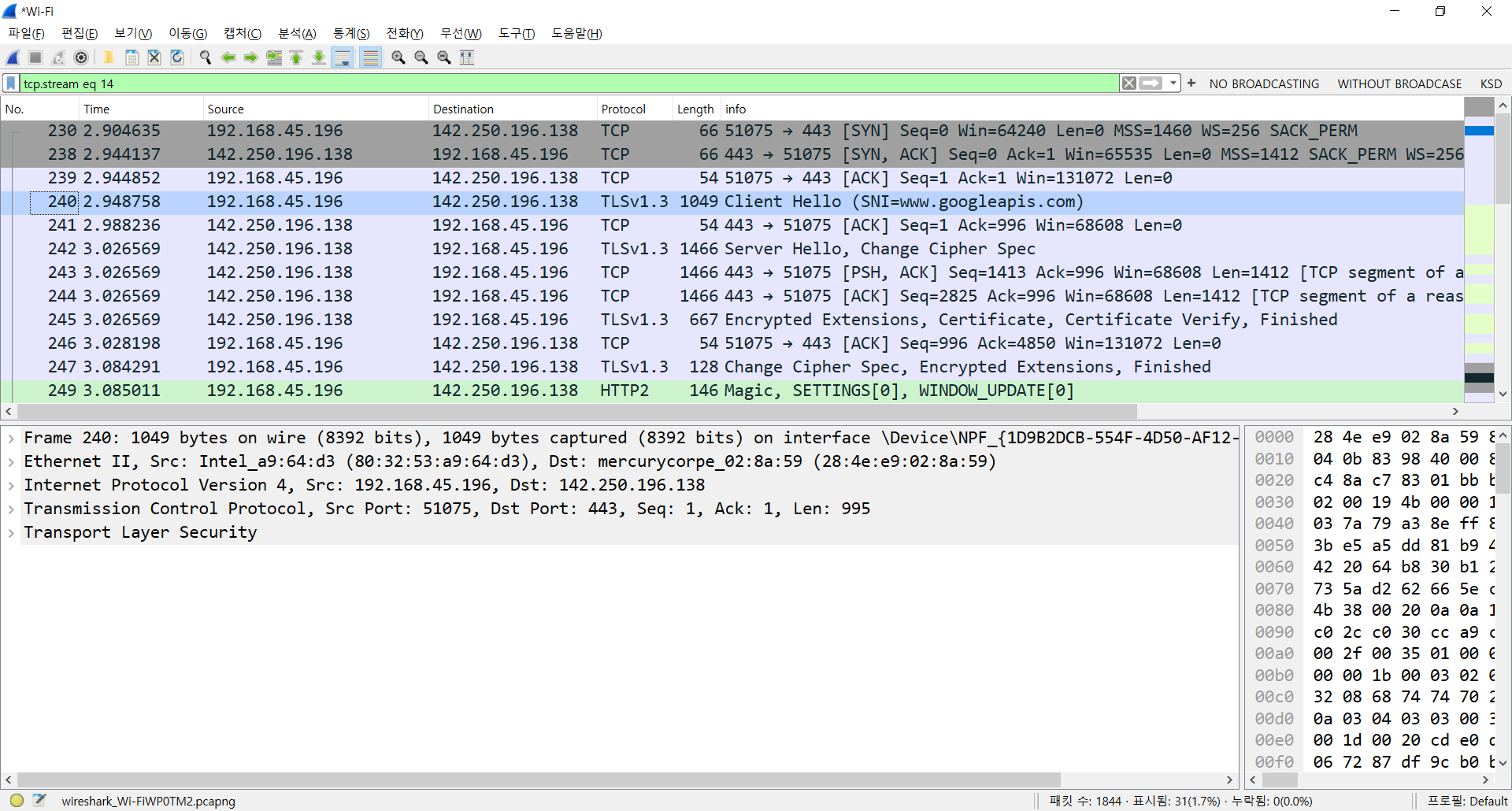 그럼 아래와 같이 내가 google.com에 접속하기 위해 TCP 연결을 맺고, 암호화 된 채널 생성을 위해 암호화 정보를 주고 받은 것들(TLS 핸드쉐이크)을 확인하실 수 있습니다.