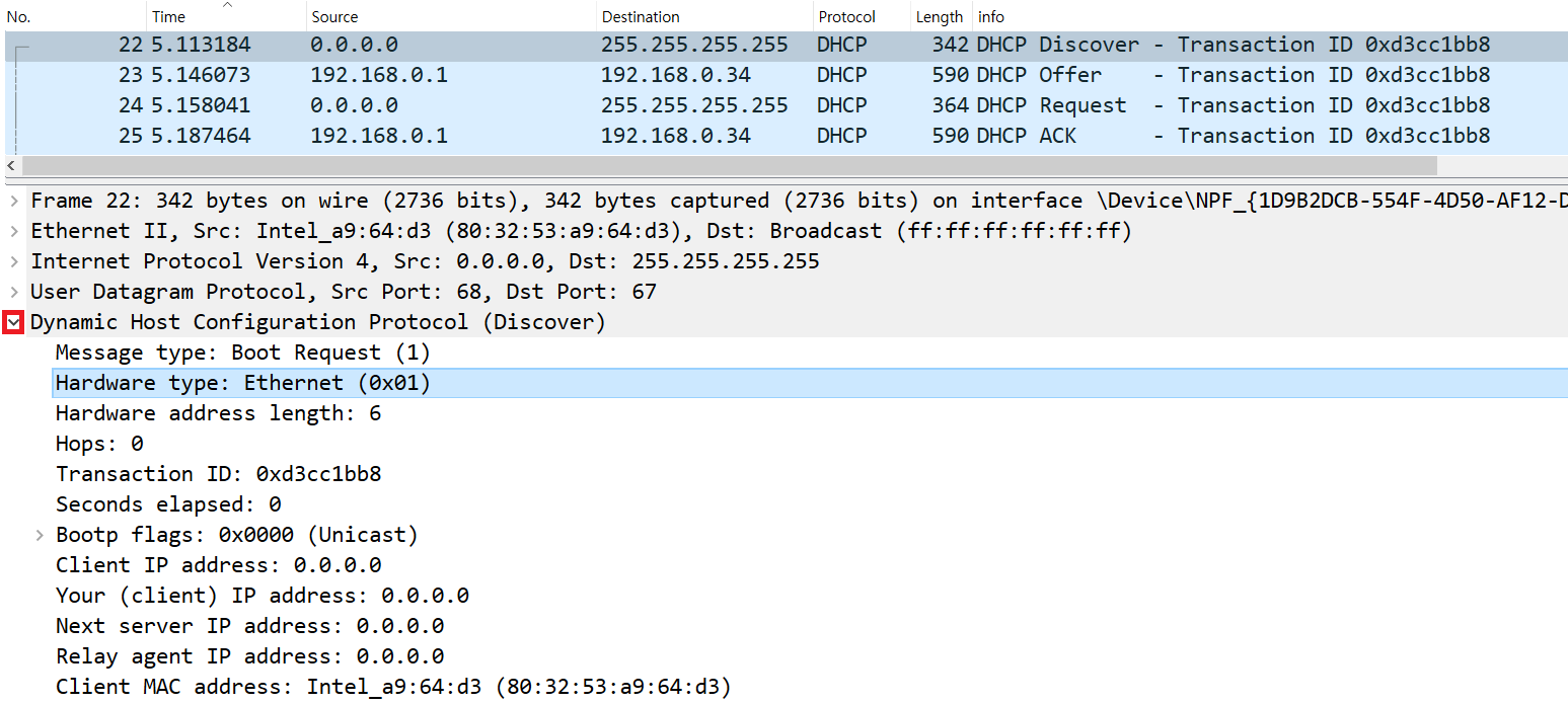 가장 먼저 "DHCP Discover" 패킷이 보입니다. ">"를 누르면 내용이 확장되어 전체 내용을 확인하실 수 있어요.