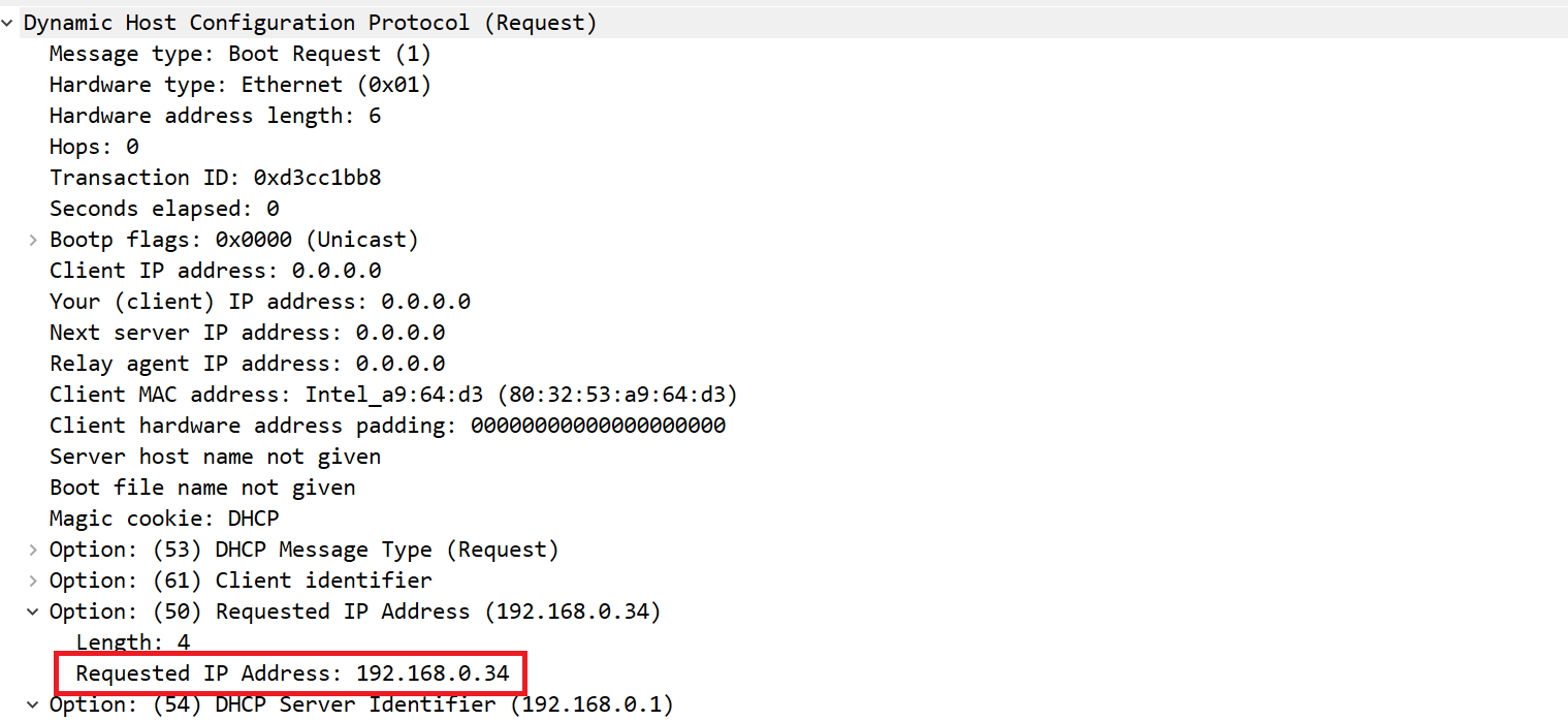 DHCP 서버는 단말로부터 DHCP Request 패킷을 받고, 할당한 IP 주소를 최종적으로 사용하라는 응답 패킷을 보내고 모든 대화가 마무리 됩니다.