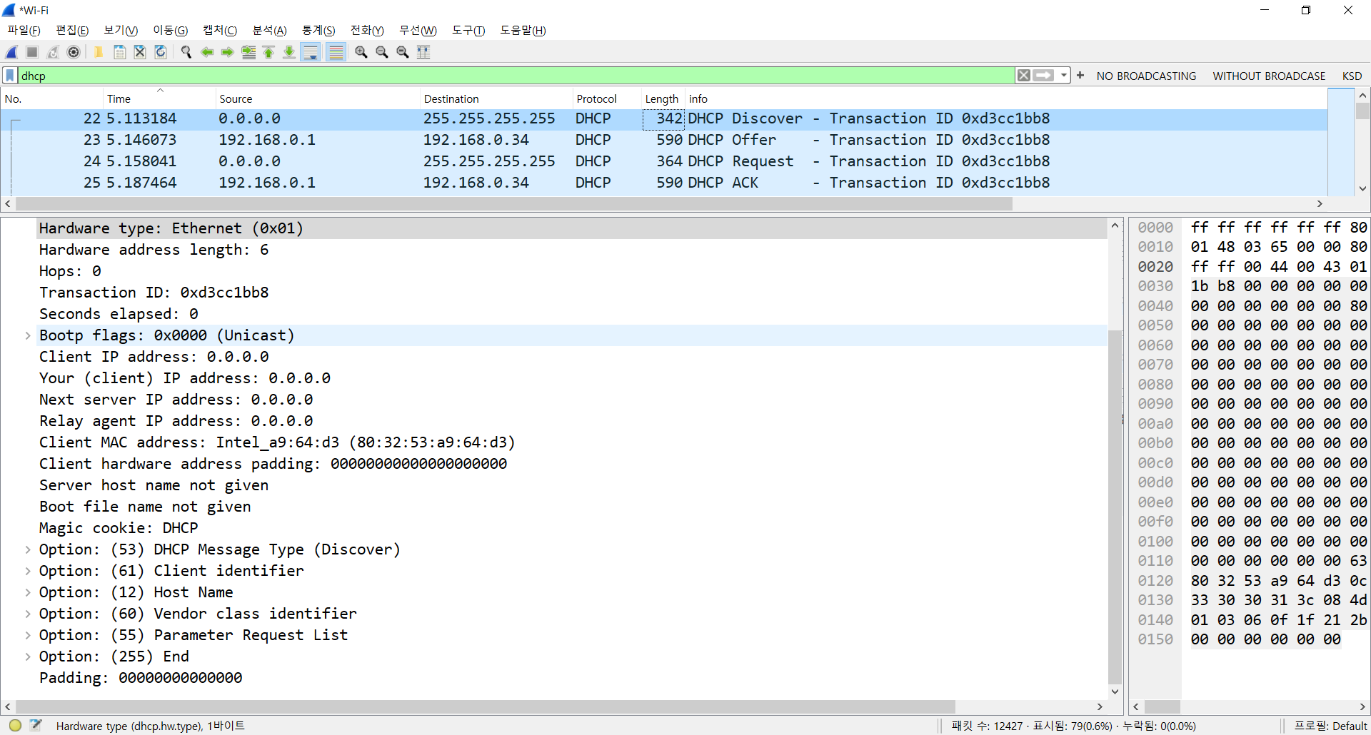 여전히 상당히 많은 패킷들이 수집이 되었겠죠? 이번에는 필터에 dhcp 라고 입력해주세요.