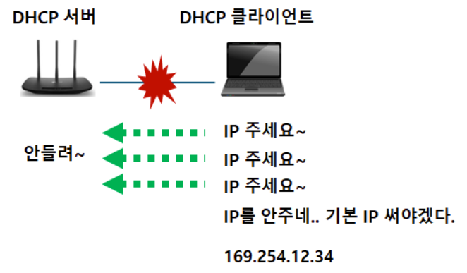 ** 위 그림 상황 분석 : 단말이 DHCP Discover 메세지를 브로드캐스팅 했지만, DHCP 서버는 이 패킷을 받지 못했기에 응답을 주지 않음, 즉, 공유기와의 연결이 문제!