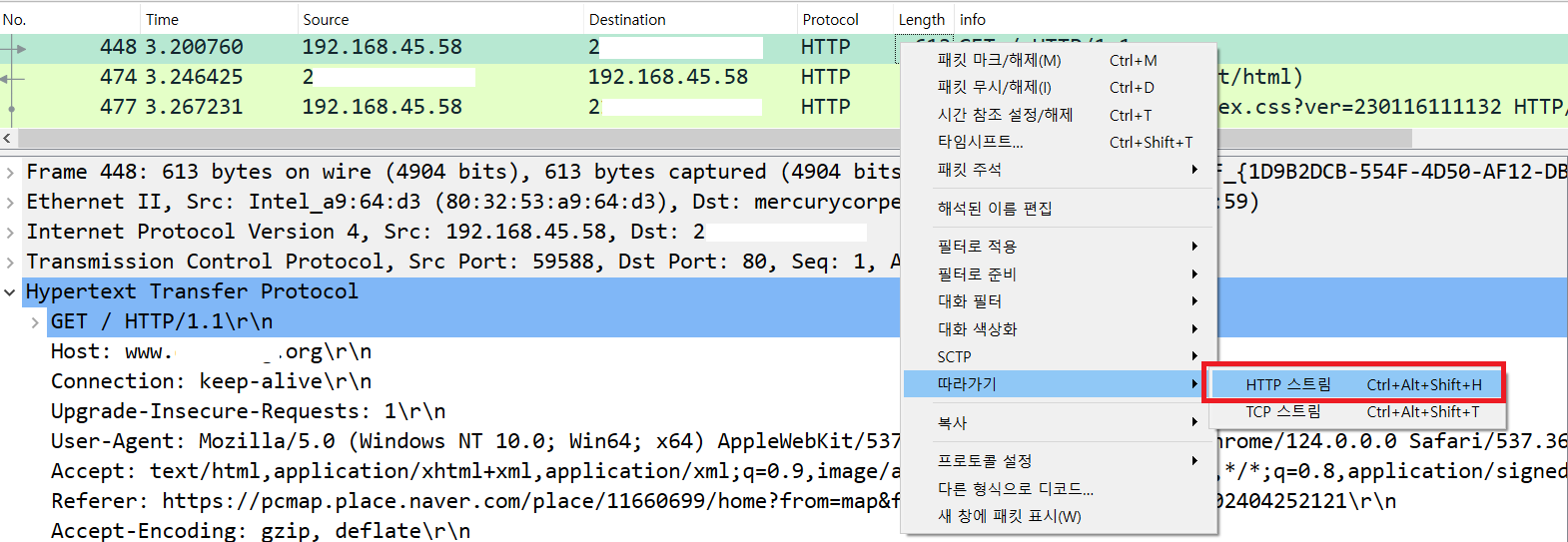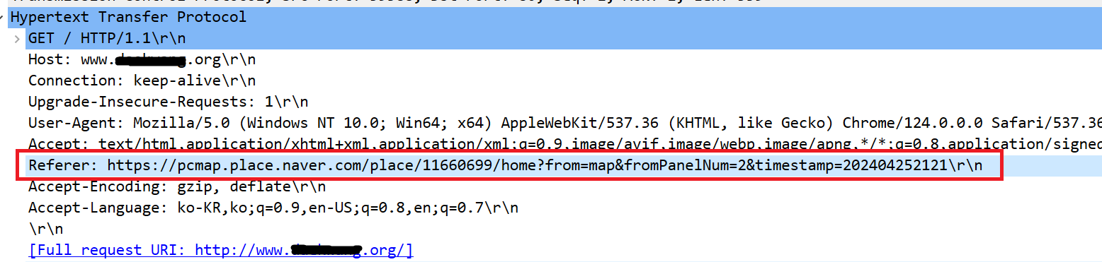 여기서 한가지 추가로 설명을 드리면 패킷 상세 데이터에 "Referer"라는 값이 있는데요. 이 값은 내가 이 페이지에 들어오기 '전'에 머물렀던 페이지 주소 입니다.