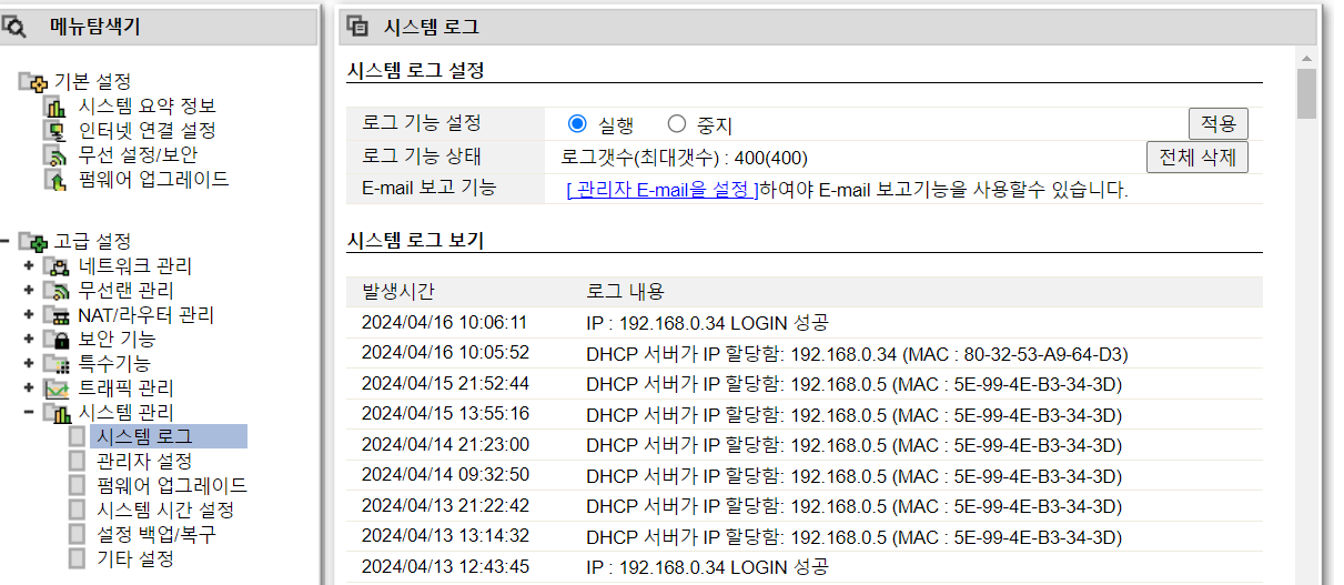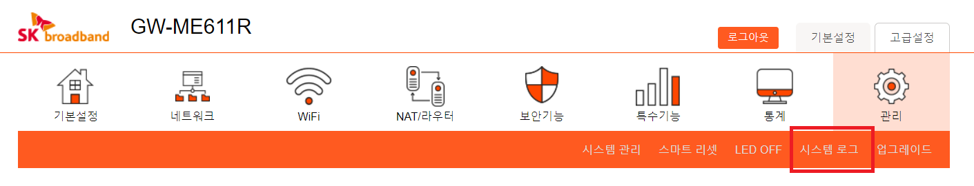 SKB 공유기와 동일하게 "시스템 로그" 매뉴를 통해 기록을 확인할 수 있습니다.